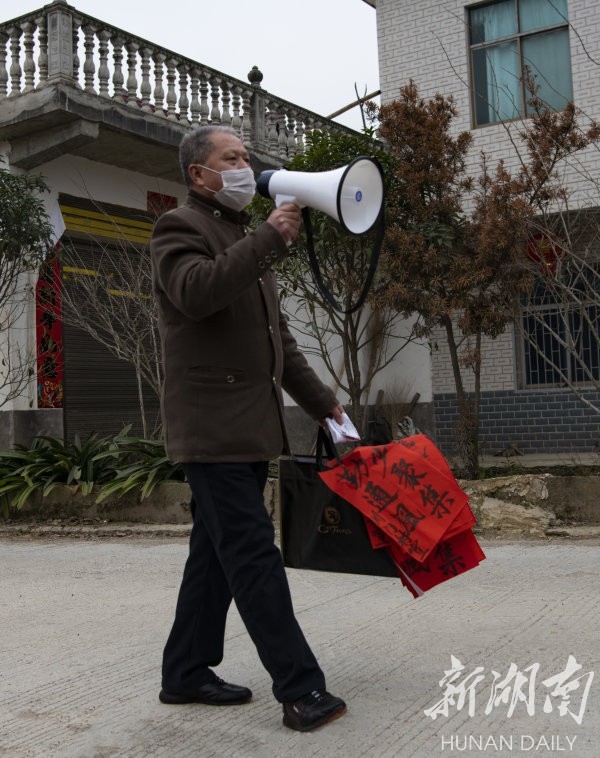 (2月1日,漣源市石馬山鎮(zhèn)川門村,67歲的老黨員聶如良在宣傳防控知識。劉再麗 攝)