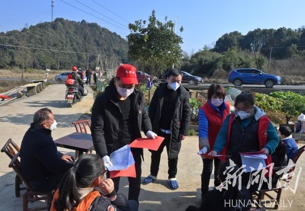 (1月31日,長沙市望城區(qū)烏山腳下的英雄嶺村,黃金園街道黨員突擊隊走進村民家,發(fā)放防護宣傳資料。湖南日報·新湖南客戶端記者 徐行 攝)