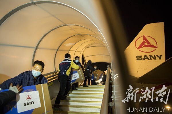 (2月5日晚,長沙黃花國際機場,三一集團用公務機從阿聯(lián)酋運回4.2萬套醫(yī)用防護服,支援防控新型冠狀病毒感染的肺炎疫情。湖南日報·新湖南客戶端記者 唐俊 攝)