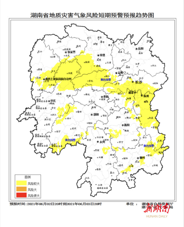 湖南日報·新湖南客戶端6月2日訊(記者 彭可心 肖秀芬)今天,省自然資源廳與省氣象局聯(lián)合發(fā)布地質(zhì)災(zāi)害氣象風險預(yù)警:自6月2日20時至3日20時,受降雨影響,湘中及湘中以南大部分區(qū)域發(fā)生突發(fā)性地質(zhì)災(zāi)害風險較大(黃色預(yù)警)。