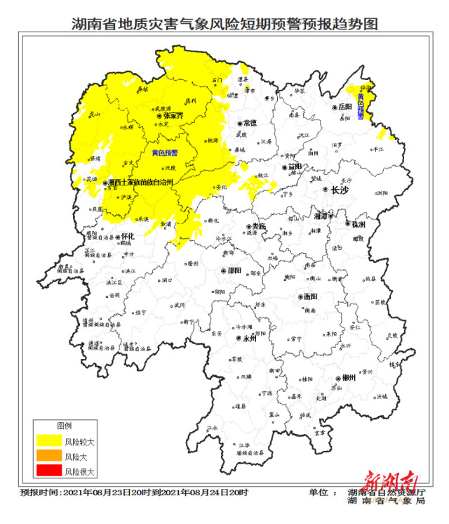 湖南日報·新湖南客戶端8月23日訊(記者 彭可心 肖秀芬)受持續(xù)降雨影響,今天省自然資源廳與省氣象局聯(lián)合發(fā)布地質(zhì)災(zāi)害氣象風(fēng)險預(yù)警:自8月23日20時至24日20時,湘中以北部分區(qū)域發(fā)生突發(fā)性地質(zhì)災(zāi)害風(fēng)險較大(黃色預(yù)警)。