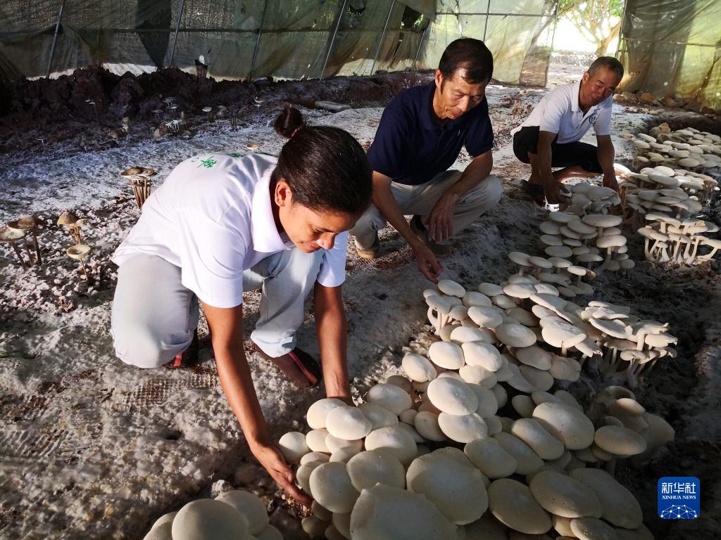 在斐濟(jì)楠迪,中國專家和當(dāng)?shù)毓蛦T檢查菌菇生長(zhǎng)情況(2018年6月12日攝)。新華社記者 張永興 攝