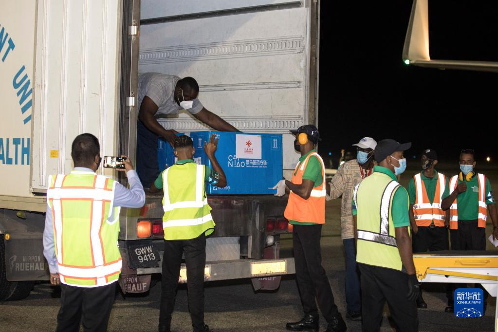 工作人員在圭亞那首都喬治敦國際機(jī)場(chǎng)搬運(yùn)中國援助的新冠疫苗(2021年3月2日攝)。新華社發(fā)(圭亞那新聞署供圖)