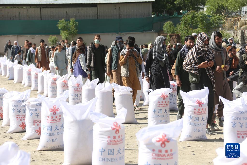 阿富汗民眾在首都喀布爾領(lǐng)取中國援助的糧食(2022年4月23日攝)。新華社發(fā)(塞夫拉赫曼·薩菲攝)