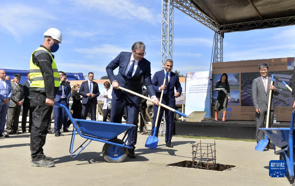 在塞爾維亞首都貝爾格萊德,塞爾維亞總統(tǒng)武契奇(中)為歐洲地區(qū)首家中國疫苗工廠奠基(2021年9月9日攝)。新華社發(fā)(普雷德拉格·米洛薩夫列維奇攝)