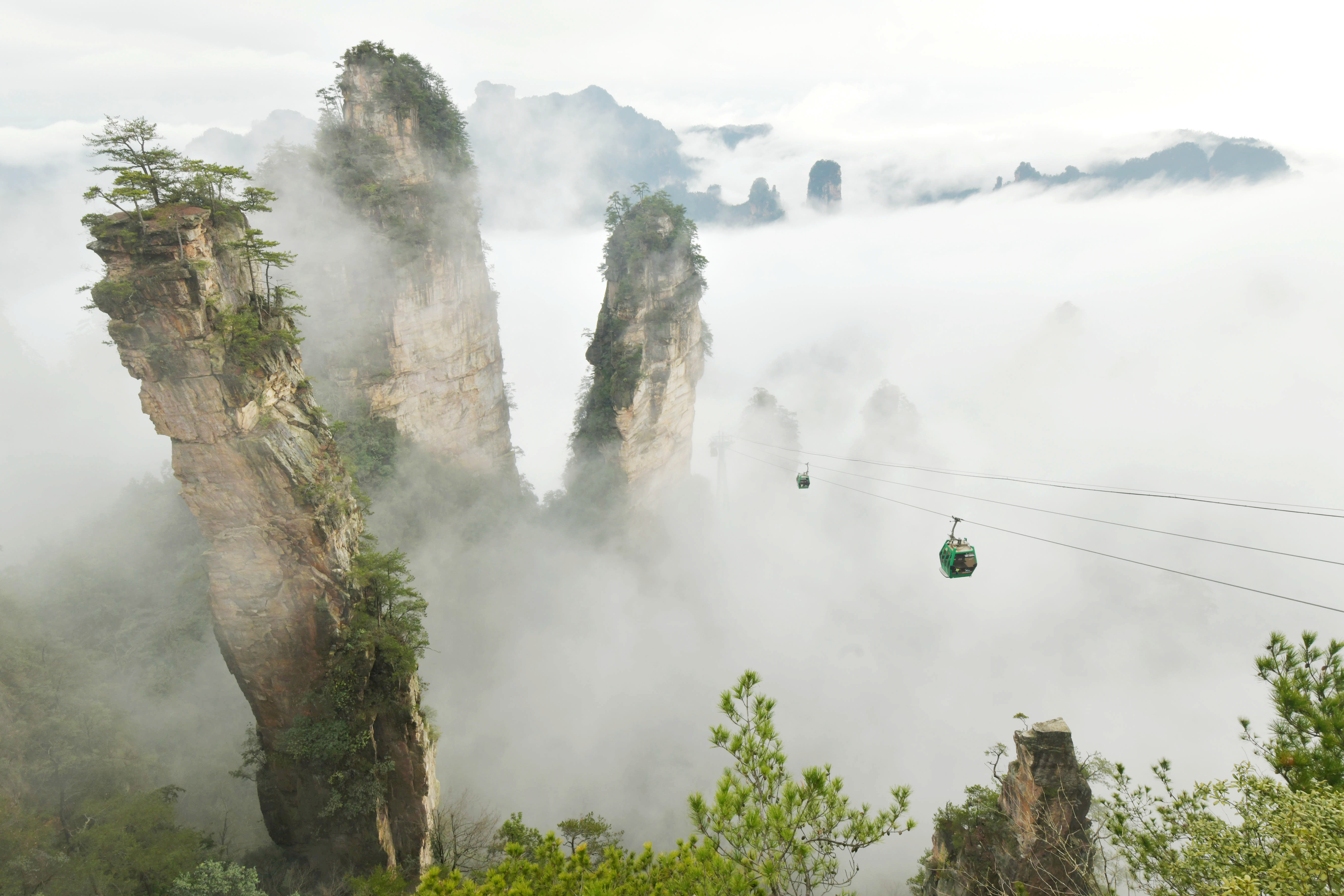 在這個秋天,如果想看壯觀無比的云海,迷魂臺是袁家界景區(qū)最好的天然觀景臺之一。立于高山之巔俯瞰,上百座石峰在峽谷中靜靜佇立,直插藍天,如樓如閣,如臺如榭,如桌如椅,如人如獸,百態(tài)千姿,氣象萬千。那漫無邊際的云海,層疊翻涌,云浪翻飛,猶如人間天堂,又令人如臨大海之濱。