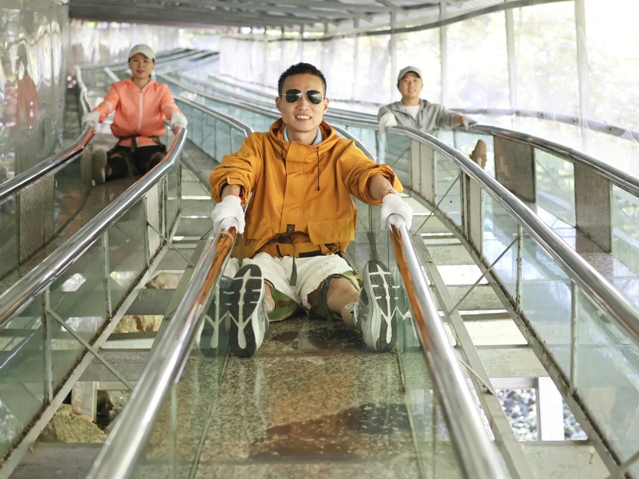 “嗖——” 穿戴好特制的滑墊褲和手套,滑行開始!滑道如玉帶飛舞、彩練當空,在山谷中尖叫回蕩,玻璃滑道兩旁被綠蔭包圍,就像進入了一個森林秘密隧道。