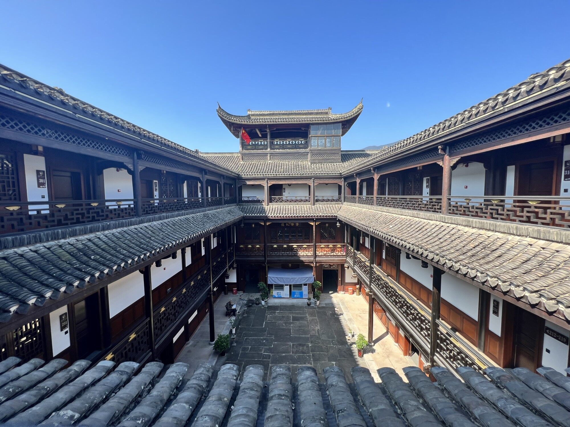 “溪居”為四合院建筑,客房面積約1200平方米,共三層。民宿主佘芳是本地人,她介紹,民宿的所有設(shè)計由其先生完成,從設(shè)計到建造花了大致三年的時間。不僅可以住宿,而且有健身房、茶吧、中醫(yī)理療室、禪房、書房等配套娛樂設(shè)施。每當(dāng)夜色降臨,人們在這里邀伴對弈,讀書品茗,遠(yuǎn)離了塵世的喧囂和煩惱,仿若一片世外桃源。